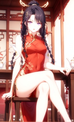 Wearing a red cheongsam and a Chinese cheongsam, sitting in a teahouse with tea on a small table, sitting on a stool with crossed legs in the teahouse,