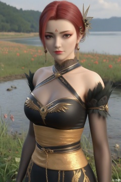 score_9_up,1girl, solo, breasts, looking at viewer, short hair, hair ornament, gloves, dress, cleavage, bare shoulders, brown eyes, jewelry, medium breasts, closed mouth, red hair, earrings, elbow gloves, black dress, makeup, halterneck, forehead mark,YaFei,outdoor,grass,flowers,lake,blue sky,sunlight,standing