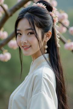 HDR photo of cinematic film still large breasts,extremely slim waist,The image is a high-resolution photograph of a young Asian woman, solo,long hair,looking at viewer,smile,black hair,hair ornament,long sleeves,jewelry,closed mouth,upper body,flower,earrings,hair flower,skirt,white chinese clothes,hanfu,realistic,hair stick,outdoors,tree,flowers, . shallow depth of field, vignette, highly detailed, high budget, bokeh, cinemascope, moody, epic, gorgeous, film grain, grainy . High dynamic range, vivid, rich details, clear shadows and highlights, realistic, intense, enhanced contrast, highly detailed