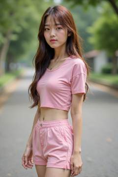 HDR photo of cinematic film still, This is a photograph of a young Asian girl, solo, long hair, breasts, looking at viewer, large breasts, brown hair, shirt, navel, brown eyes, standing, short sleeves, cowboy shot, outdoors, shorts, day, midriff, blurry, tree, lips, crop top, blurry background, pink shirt, realistic, arms at sides, road, street, photo background, pink shorts, extremely slim waist, girlm,