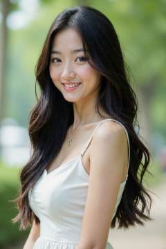 HDR photo of cinematic film still, This is a photograph of a young Asian girl, solo, long hair, looking at viewer, large breasts, black hair, brown eyes, smile, white dress, realistic, outdoors,