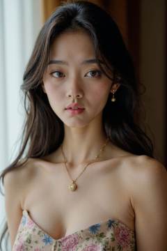 HDR photo of cinematic film still, This is a photograph of a young Asian girl, solo, breasts, looking at viewer, long hair, large breasts, black hair, dress, cleavage, bare shoulders, brown eyes, jewelry, collarbone, upper body, earrings, parted lips, indoors, blurry, lips, window, strapless, blurry background, floral print, strapless dress, realistic, smooth skin, girln,