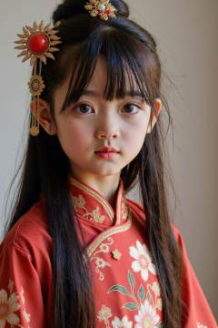 The image is a high-resolution photograph featuring a young girl, solo, hair ornament, long hair, chinese dress, upper body, black hair, looking at viewer,