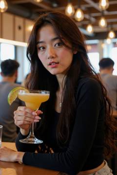 The image is a high-resolution photograph featuring a young woman with long black hair, fair skin, and a slender physique, seated in a modern, warmly lit restaurant. She wears a black long-sleeved top and holds a cocktail glass with a lime wedge. In the background, other patrons, including a man in a grey shirt, are seated at tables. The decor features contemporary lighting fixtures and a mix of wood and metal accents. The atmosphere is casual yet sophisticated, with a focus on contemporary design and comfort.