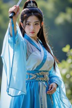 Cinematic photo a photograph of a teenage young woman with fair skin and long black hair,fighting pose,large breasts,hand holding a sword,see-through,self-luminous neon armor,science fiction,cyberpunk,robot joints,blue and white hanfu,embroidery,dao robe,transparent cloak,full body,outdoors, <lora:20250503_AgainCharactersF1Lora_10:0.5>
