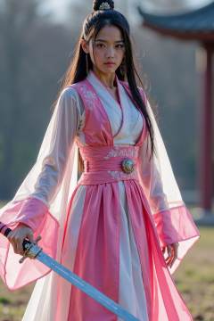 Cinematic photo a photograph of a teenage girl with fair skin and long black hair,fighting pose,large breasts,hand holding a sword,see-through,self-luminous neon armor,science fiction,cyberpunk,robot joints,pink and white hanfu,embroidery,dao robe,transparent cloak,full body,outdoors,
