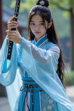 Cinematic photo a photograph of a teenage young woman with fair skin and long black hair,fighting pose,large breasts,hand holding a sword,see-through,self-luminous neon armor,science fiction,cyberpunk,robot joints,blue and white hanfu,embroidery,dao robe,transparent cloak,full body,outdoors,