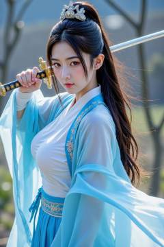 Cinematic photo a photograph of a teenage young woman with fair skin and long black hair,fighting pose,large breasts,hand holding a sword,see-through,self-luminous neon armor,science fiction,cyberpunk,robot joints,blue and white hanfu,embroidery,dao robe,transparent cloak,full body,outdoors, <lora:20250503_AgainCharactersF1Lora_10:0.8>
