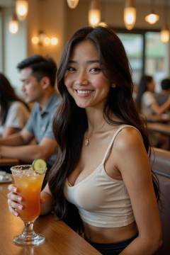 large breasts,HDR photo of cinematic film still the image is a high-resolution photo of a young girl with long straight black hair,who is smiling directly at the camera. She is seated at a wooden table and is wearing a form-fitting,white top crop top,that accentuates her slender physique and large breasts,extremely slim waist,In her right hand,she holds a cocktail garnished with a lime wedge and a slice of cucumber,which adds a pop of color to the image.,In the background,there are several other patrons seated at tables. A man with short black hair,wearing a grey polo shirt,is engaged in conversation with another person,while a woman with long,straight black hair,wearing a white blouse,is focused on her phone. The restaurant's interior is modern and elegant,with a mix of warm and cool tones. The walls are adorned with decorative tiles,and there are hanging pendant lights above the tables,casting a warm,inviting glow. The seating is a combination of cushioned chairs and padded benches,with a neutral color palette that enhances the overall sophisticated ambiance. The photograph captures a moment of casual dining in a stylish setting. . shallow depth of field,vignette,highly detailed,high budget,bokeh,cinemascope,moody,epic,gorgeous,film grain,grainy . High dynamic range,vivid,rich details,clear shadows and highlights,realistic,intense,enhanced contrast,highly detailed,