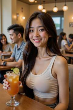 large breasts,HDR photo of cinematic film still the image is a high-resolution photo of a young girl with long straight black hair,who is smiling directly at the camera. She is seated at a wooden table and is wearing a form-fitting,white top crop top,that accentuates her slender physique and large breasts,extremely slim waist,In her right hand,she holds a cocktail garnished with a lime wedge and a slice of cucumber,which adds a pop of color to the image.,In the background,there are several other patrons seated at tables. A man with short black hair,wearing a grey polo shirt,is engaged in conversation with another person,while a woman with long,straight black hair,wearing a white blouse,is focused on her phone. The restaurant's interior is modern and elegant,with a mix of warm and cool tones. The walls are adorned with decorative tiles,and there are hanging pendant lights above the tables,casting a warm,inviting glow. The seating is a combination of cushioned chairs and padded benches,with a neutral color palette that enhances the overall sophisticated ambiance. The photograph captures a moment of casual dining in a stylish setting. . shallow depth of field,vignette,highly detailed,high budget,bokeh,cinemascope,moody,epic,gorgeous,film grain,grainy . High dynamic range,vivid,rich details,clear shadows and highlights,realistic,intense,enhanced contrast,highly detailed, <lora:20250503_AgainCharactersF1Lora_10:0.5>