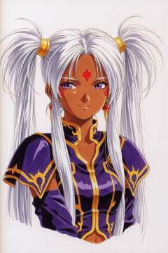 Hild,1girl,solo,forehead mark,facial mark,white hair,1990s \(style\),long hair,twintails,retro artstyle,jewelry,smile,white background,purple eyes,earrings,dark skin,simple background,traditional media,<lora:Ah! My Goddess_illustriousXL:1>,