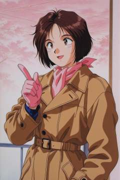 Megumi Morisato,OVA Style,retro artstyle,1girl,solo,1990s \(style\),gloves,short hair,brown hair,brown eyes,pink gloves,smile,open mouth,index finger raised,coat,pointing,scarf,upper body,jacket,<lora:Ah! My Goddess_illustriousXL:1>,