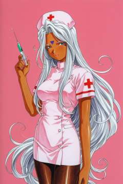 Urd,1girl,solo,nurse,syringe,long hair,hat,forehead mark,facial mark,nurse cap,pantyhose,dark skin,white hair,dark-skinned female,very long hair,traditional media,1990s \(style\),<lora:Ah! My Goddess_illustriousXL:1>,