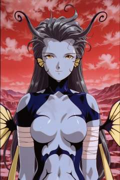 OVA Style,Morgan,1girl,solo,yellow eyes,wings,colored skin,black hair,breasts,long hair,antennae,cloud,sky,insect wings,outdoors,genderswap \(mtf\),genderswap,red sky,monster girl,arthropod girl,grey skin,medium breasts,retro artstyle,1990s \(style\),upper body,insect wings,looking at viewer,light smile,bandage,<lora:Ah! My Goddess_illustriousXL:1.3>,