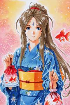 Belldandy,1girl,japanese clothes,goldfish,kimono,solo,1990s \(style\),forehead mark,goldfish,retro artstyle,brown hair,facial mark,long hair,long sleeves,sash,obi,yukata,blue kimono,holding bag,traditional media,colorful background,upper body,<lora:Ah! My Goddess_illustriousXL:1>,