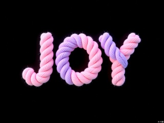The word "JOY" is spelled out in soft pink and purple ropes against a black background. The ropes, intertwined playfully, have a fluffy texture with a gentle glow. Centered and cheerful, "JOY" embodies warmth and happiness, ideal for spreading joy and positivity.