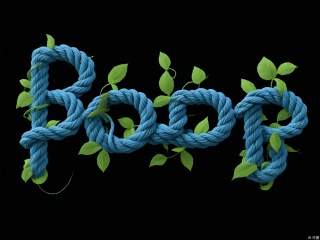 XTZT, The word "SERENITY" is spelled out in harmonious green and blue ropes against a black background. The ropes, mimicking tender vines with leaf-like knots, create a serene atmosphere. Centered and calming, "SERENITY" embodies peace and tranquility.