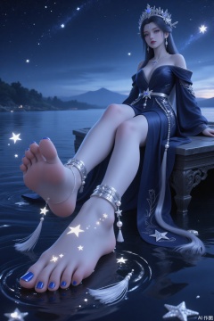 - Legs and Feet: The legs have a slender line. The toenails are painted blue with high gloss. Silver ankle bracelets are worn on the ankles, with star decorations, tassels, and pearl pendants. This describes in detail the legs, toenail polish, and the style of the ankle bracelets.