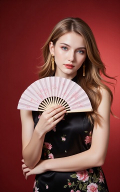 mote,pifu,baoshi,lvjing,long hair,blonde hair,jewelry,earrings,blue eyes,ring,lips,red_lips_,1girl,dress,hand fan,holding,solo,earrings,jewelry,chinese clothes,china dress,black dress,holding fan,floral print,blurry,sleeveless,looking at viewer,sleeveless dress,red background,folding fan,standing,head tilt,2,cover,simple background,gradient background,close-up details,outstanding style,adding a touch of dimension to your images without compromising details,close-up,
