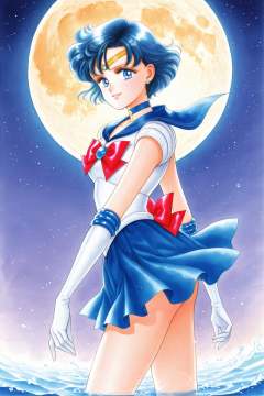 1girl,solo,sailor senshi uniform,gloves,magical girl,blue eyes,skirt,choker,red bow,short hair,tiara,blue hair,back bow,jewelry,elbow gloves,sailor collar,white gloves,sailor mercury,earrings,blue skirt,smile,blue sailor collar,full moon,blue choker,mizuno ami,brooch,pleated skirt,circlet,water,sky,looking at viewer,water on sky,traditional media,<lora:Takeuchi Naoko_illustriousXL:1>,