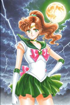1girl,sailor senshi uniform,sailor jupiter,green sailor collar,skirt,magical girl,kino makoto,choker,green skirt,sailor collar,brown hair,tiara,jewelry,hair ornament,pleated skirt,earrings,pink bow,gloves,ponytail,elbow gloves,brooch,back bow,hand on own hip,long hair,looking at viewer,standing,smile,green eyes,full moon,green choker,day,cloud,lightning,traditional media,<lora:Takeuchi Naoko_illustriousXL:1>,