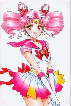 Sailor Chibi Chibi,1girl,solo,sailor senshi uniform,hair bun,brooch,magical girl,pink hair,skirt,jewelry,cone hair bun,heart brooch,double bun,sailor collar,back bow,multicolored skirt,bow,gloves,red eyes,twintails,smile,white gloves,elbow gloves,pink sailor collar,hair ornament,heart,white background,choker,hairpin,open mouth,short hair,red bow,pleated skirt,:d,tiara,crescent,traditional media,<lora:Takeuchi Naoko_illustriousXL:1>,