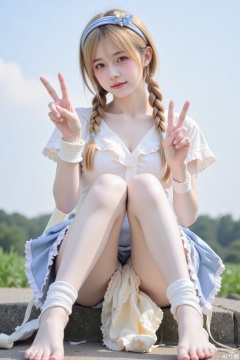 1girl, barefoot, braid, twin braids, v, blonde hair, smile, flower, skirt, looking at viewer, long hair, blush, hairband, short sleeves, blue skirt, frills, ribbon, white shirt, hair ribbon, toes, yellow eyes, shirt, wrist cuffs, feet, sky, sitting, jacket
