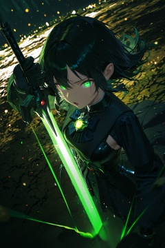 masterpiece,best quality,amazing quality,very aesthetic,absurdres,newest,in the style of fashion photography,light particles,cinematic lighting,Visual impact,sharp focus,Emotionalization,depth of field,dynamic pose,dutch angle,extreme aesthetic,scenery,vivian,(aos:0.5),(fajyobore:0.5),(chiaroscuro:0.5),from_above,anime girl,glowing green sword,dark forest background,intense gaze,wind blowing through hair,dynamic lighting,dramatic pose,armor,fantasy setting,intricate details,raise your weapon,brandishing a weapon,fu_r_y,:o,shoutmon,