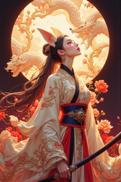 chahua,XUER martial arts style,(Masterpiece, high quality, best quality, official art, beautiful and aesthetic:1.2),(single girl),(extremely detailed),(fractal art:1.3),(colorful),(highest detail),(flowers),(profile),(looking up),(warm light),(artistic),hanfu,tang style outfits,<lora:hanfuTang_v32:0.7>,red lips,lipstick,kitsune,transformed into human form,mythological figure,two fox ears,huxian,