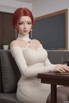 score_9_up,1girl, solo, breasts, looking at viewer, short hair, hair ornament, ((white sweater dress)), cleavage, bare shoulders, brown eyes, jewelry, medium breasts, red hair, earrings, makeup, forehead mark,YaFei,modern,living room,television,coffee table,sitting on the couch,red nail polish