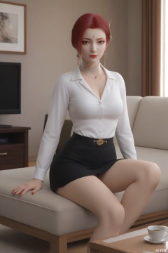 score_9_up,1girl, solo, breasts, looking at viewer, short hair, hair ornament, ((white shirt )), cleavage, brown eyes, jewelry, medium breasts, red hair, earrings, makeup, forehead mark,YaFei,modern,living room,television,coffee table,sitting on the couch,red nail polish,crossed_legs_(sitting)