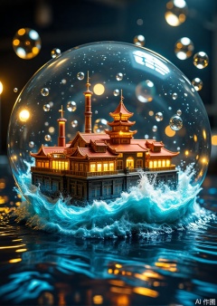 In ultra-high macro focus, waves crash against the glass interior's replica of Zhanqiao Pier, their frothy crests  (frozen as liquid crystal) with iridescent light refractions. The shallow depth of field blurs a dreamlike background where luminous beer bubbles—backlit by holographic LEDs—rotate in slow motion, their golden haze merging with the amber hues of Tsingtao's iconic brew. The composition balances historical architecture, modern industry, and whimsical alchemy, all sealed in a snow-globe-like vessel that captures the city's soul in a single, surreal glance.