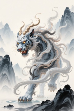 Fluid ink and water wind, white tiger, referring to the mountain and sea classics, thick ink and heavy color, fierce tiger descending the mountain, dynamic, ethereal, Zen, detailed composition