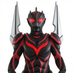 looking at viewer,ultraman,bodysuit,gloves,legwear,boots,cover,mask,plugsuit,armor,bodysuit,pattern on body,tight-fitting,helmet,leather suit,latex,tokusatsu,no humans,science fiction,hard mask,no smile,no eyes,no nose,rubber bodysuit with line,alien,wings,black rubber bodysuit with red line