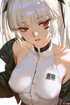 1girl, solo, long hair, breasts, bangs, simple background, shirt, red eyes, white background, bare shoulders, twintails, medium breasts, jacket, white shirt, white hair, parted lips, open clothes, sleeveless, off shoulder, open jacket, black jacket, barcode, barcode tattoo