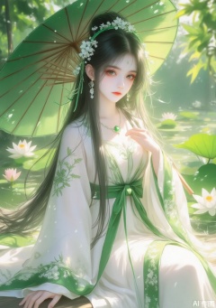 This image is a digital illustration in the style of traditional Chinese painting, showcasing a serene scene set in a lush, green pond. The central figure is a young woman with long, straight, jet-black hair adorned with delicate floral accessories. She is sitting on a wooden dock, surrounded by lily pads and water lilies. Her attire is a flowing, white silk dress with intricate green embroidery, featuring a wide, green sash tied at the waist. The dress has long, flowing sleeves that cascade gracefully around her, and she holds a large, green parasol above her head, providing shade from the bright sunlight that filters through the leaves.
