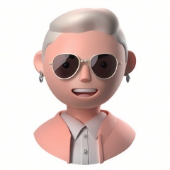 3D-rendered avatar with rosy cheeks, silver-white buzz cut, and a cheerful laugh. Dressed in a peach-pink tracksuit, diamond-shaped earrings, and mirrored aviators. White background, soft glow effects.