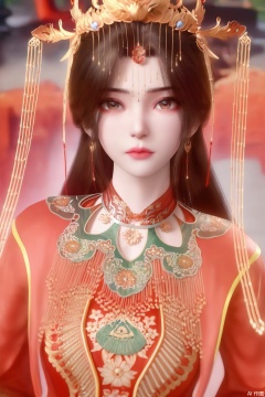 1girl, solo, long hair, looking at viewer, brown hair, hair ornament, dress, brown eyes, jewelry, closed mouth, upper body, chinese clothes, red dress,