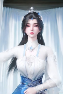 1girl, solo, long hair, looking at viewer, black hair, hair ornament,earrings,  jewelry, upper body,  long sleeves, dress,white dress, sash, curtains,