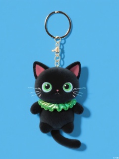 WOGJ, Image of a glossy black cat keychain with embroidered whiskers, green sequin eyes, and a glittery collar. Its tail curls upward, and it hangs from a star-shaped keyring. A baby-blue background accentuates its sleek, modern design.
