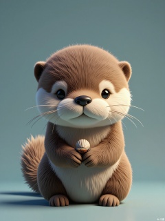 Detailed CGI render of a baby sea otter with dense fur, whiskered face, and a playful expression. It floats on its back, holding a shell charm, against a teal-blue background. Soft lighting and lifelike textures create a heartwarming scene.