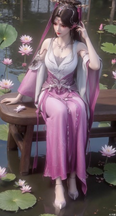 (masterpiece:1.2),best quality,The image is a digital illustration of a young woman sitting on a wooden bench in a pond with lily pads. She is wearing a long dress with design on the chest and sleeves. The dress has a high neckline and short sleeves,Holding a lotus in hand. She has long dark hair styled in loose waves and is wearing gold high heels. The woman is posing with one hand on her hip and the other resting on the edge of the bench. The background is filled with pink and white lotus flowers and green leaves. The overall mood of the image is peaceful and serene,(huge breasts:2.99),(full breasts:2.99),(Background with traditional Chinese architecture,Pond, water lilies:1.39),,XliushenWDDk,Xziyanlonghuang,XjiningshuangX2,XcaiyunxianziK,XlimuwanXJCB,XzilingK,Xzixink