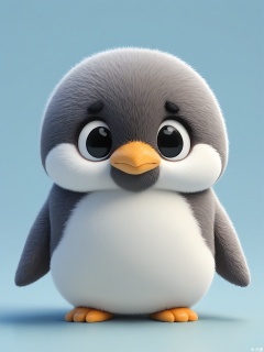 DWXX, Detailed CGI of a penguin chick with fluffy down, black eyes, and a comical expression. It waddles forward, wings outstretched, on an ice-blue background. The style blends realism with a cheerful, cartoonish touch.