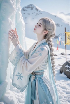 The woman with silver-white hair in a neat double braid wears a snow-white wide-sleeved robe with ice-blue snowflake patterns and a silver tassel belt around her waist. On the snowy mountain peak with white snow, ice crystals and fluttering prayer flags in the cold wind, she stands sideways next to an ice crystal, slightly tilting her head back and stretching her hand to touch it. Her makeup is a cold and elegant ice snow style with silver eye shadow and a pale purple lip. With cinematic lighting and ray tracing highlighting the very aesthetic appearance of her shiny skin and the detailed textures of her costume, she stands firmly against the snowy background. Her expression is stern yet with a hint of tenderness, and her eyes are determined as she interacts with the icy environment.
