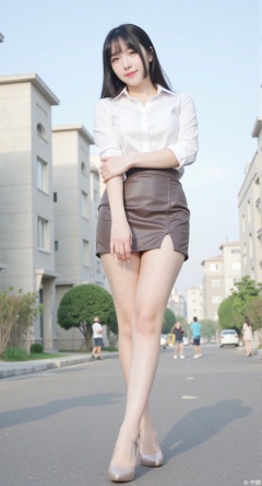 1girl, solo, long hair, looking at viewer, skirt, brown hair, shirt, black hair, brown eyes, standing, high heels, crossed arms, building, pencil skirt, city, office lady, giant, giantess, photo background