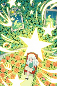 A digital anime-style drawing depicts a young girl with long,white hair and a green dress sitting on a chair amidst a lush garden filled with orange roses. She reads a book,surrounded by swirling,glowing star shapes. The background features a green ivy-covered wall with windows and a vibrant,dreamy atmosphere,