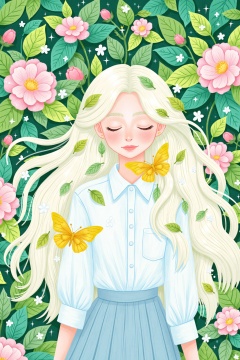 Dreamlike illustration,Depict an ethereal and whimsical digital drawing in a vibrant,soft color palette. The painting depicts a woman whose long,flowing white hair is studded with delicate green leaves and small white flowers. She had a serene,almost dreamy expression,with her eyes closed and a golden butterfly fluttering around her. The girl wore a collared button-down white shirt and a light blue pleated skirt. A large golden butterfly lands on her shirt,her skin is pale and has a soft luster,she has a serene look,the background is a forest of lush green leaves and pink camellias,vivid details of leaves and flowers,intricate textures and delicate patterns,harmoniously interwoven with the girl's costume,giving a feeling of harmony and unity with nature.,