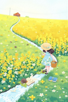 Illustrations depicting spring,In the spring fields,a young girl dressed in a light blue floral cotton dress and wearing a woven straw hat moves through the golden rape blossom fields with a small bamboo basket. She hums a cheerful tune while gently picking fresh wild vegetables. The breeze blows,lifting her skirt and the hair adorned with forsythia flowers. She then walks to the field ridge,crouches down to curiously and tenderly observe a small snail on a grass leaf,and rises to walk to a nearby clear stream. She places the bamboo basket by the stream and squats to scoop up the cool stream water and sprinkle it into the air. Afterwards,she sits on the grass by the stream,takes out an old poetry book from the bamboo basket,and quietly reads under the warm sunlight. Around her are blooming wildflowers and fluttering butterflies. In the evening,the sunset's afterglow shines upon her as she walks along the country path with the bamboo basket on her back,and the figure gilded with golden light gradually fades away.,