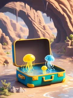 CYSJ, A sleek carbon-fiber suitcase with neon trim holds a bioluminescent cave—crystal formations glow in aquamarine and violet, a translucent jellyfish-like creature floats through underground pools, and stalactites drip into a subterranean lake.