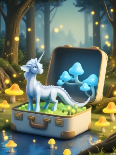 CYSJ, A tarnished silver suitcase holds an enchanted forest at dusk—glowing mushrooms dot mossy ground, a unicorn dips its horn into a silver pond, and fireflies trace patterns around twisted trees with bark like dragon scales.